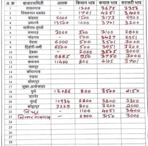 पुणे:-सध्या बाजारामध्ये आवक कमी जास्त होत असल्यामुळे कांद्याचे दर देखील कमी जास्त होत आहेत. सध्या बऱ्याच ठिकाणी नवीन पावसाळी कांदा निघायला सुरुवात झाली असल्यामुळे अवक बऱ्यापैकी येत आहे. बाजार पेठ मध्ये कांद्याला असलेल्या मागणीमुळे सध्या दर टिकून आहेत. सध्या बाजारामध्ये सरासरी दर हे 3000 ते 3400 च्या दरम्यान आहेत. महाराष्ट्रातील सर्व बाजारपेठेतील कांद्याचे दर पुढील प्रमाणे. सर्व दर हे क्विंटल मध्ये आहेत.